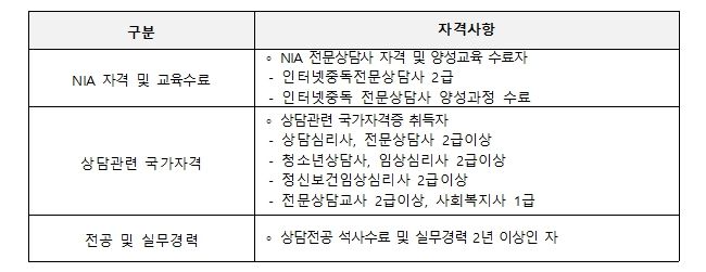 선발 자격은 ▲한국지능정보사회진흥원 시행 인터넷 중독 전문상담사 2급 자격증 소지자 ▲인터넷중독 전문인력 양성교육 이수자 등 관련 자격을 갖춘 인력이다.
