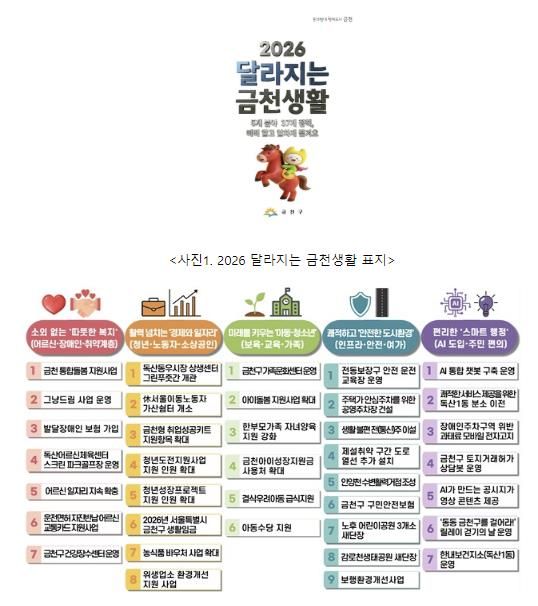 구는 이번 2026 달라지는 금천생활에 지역주민들이 일상생활에서 직접 체감할 수 있는 변화를 중심으로 37개 정책을 담았다. ▲복지(7개) ▲경제·일자리(8개) ▲아동·청소년(6개) ▲안전·도시환경(9개) ▲행정(7개) 등 5개 분야다.