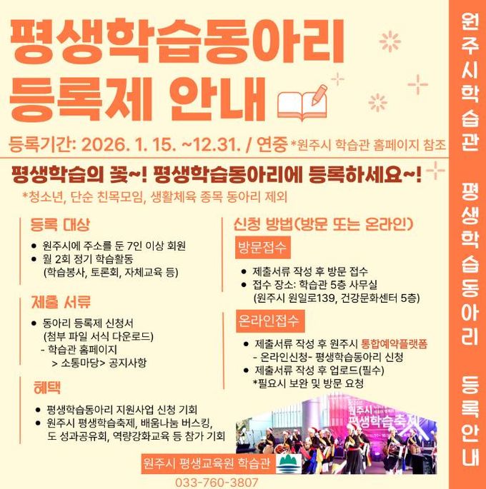 평생학습동아리로 등록하면 강원특별자치도 성과공유회 및 역량강화교육, 원주시 평생학습 축제 및 배움나눔 버스킹, 재능기부 활동 등에 참가할 수 있는 기회가 제공된다.