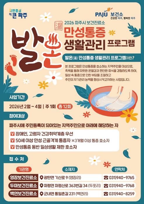 (포탈뉴스통신) 파주시 보건진료소는 보건의료 취약지역 주민들의 건강증진을 위해 2026년 ‘발온(溫) 만성통증 생활관리’교실을 운영한다.