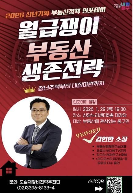 (포탈뉴스통신) 서울 중구가 급변하는 부동산 환경 속에서 주민들의 현실적인 대응 전략을 돕기 위해 오는 29일 저녁 7시 신당누리센터 5층 대강당에서 올해 첫 도시런(learn) 스쿨‘신년기획 부동산 전략 인포(INFO)데이’를 연다.