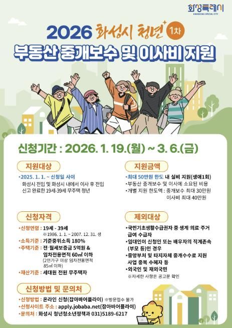 (포탈뉴스통신) 화성특례시가 19일부터 3월 6일까지 청년들의 주거비 부담 경감 및 정주 여건 향상을 위한 ‘2026년 상반기 청년 부동산 중개보수 및 이사비 지원사업’ 신청을 받는다.