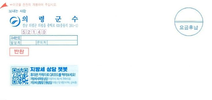 (포탈뉴스통신) 의령군은 지방세 고지서 전면에 ‘지방세 챗봇 상담서비스’ QR코드를 삽입해 발송한다고 밝혔다.