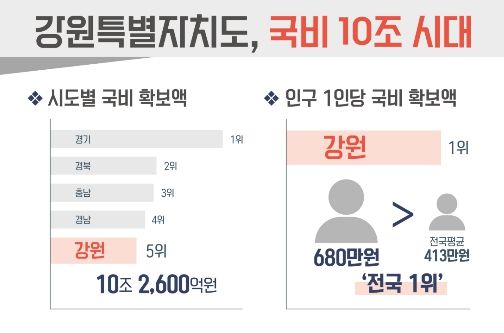 (포탈뉴스통신) 강원특별자치도는 국비 확보 10조 시대에 진입한 가운데, 인구 1인당 국비 확보액이 약 680만 원으로 전국 1위에 해당한다고 밝혔다.