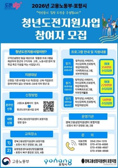 (포탈뉴스통신) 포항시는 장기간 미취업 상태이거나 구직에 어려움을 겪는 청년들의 노동시장 복귀를 지원하기 위해 ‘2026 청년도전지원사업’ 참여자를 선착순 모집한다.