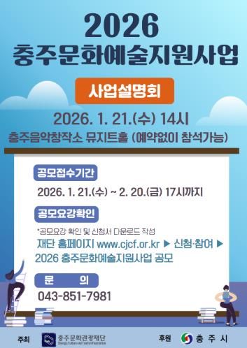(포탈뉴스통신) (재)충주문화관광재단은 충주시 예술인 및 예술단체의 창작활동 기반을 마련하여 문화예술 생태계를 조성하고자 1월 19일부터‘2026 충주문화예술지원사업’공모를 진행하고 있다고 밝혔다.