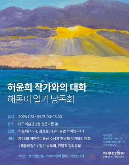 (포탈뉴스통신) 대구문화예술진흥원 대구미술관은 제25회 이인성미술상 수상자전 ‘허윤희: 가득찬 빔’의 전시 연계 프로그램으로 ‘허윤희 작가와의 대화: 해돋이 일기 낭독회’를 1월 23일 오후 3시, 대구미술관 2층 선큰가든에서 개최한다.