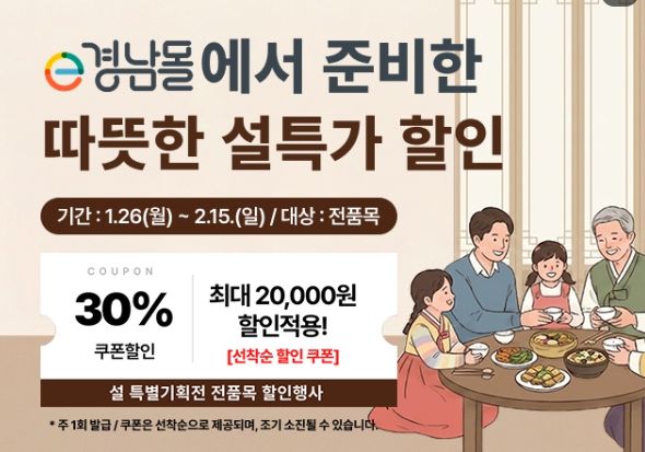 이번 기획전은 명절 선물 세트를 포함한 e경남몰의 모든 상품에 30%(최대 2만 원) 할인 혜택을 제공하며, 입점 업체별로 자체 할인 행사도 함께 진행돼 실제 구매 시 적용받는 할인 혜택은 더 크다.