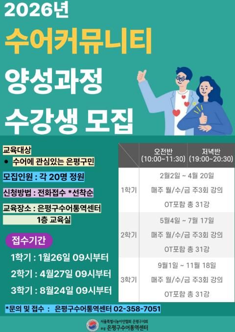 (포탈뉴스통신) 서울 은평구는 ‘2026년 수어커뮤니티 양성과정’ 1학기 수강생을 26일 오전 9시부터 선착순으로 20명을 모집한다고 밝혔다.