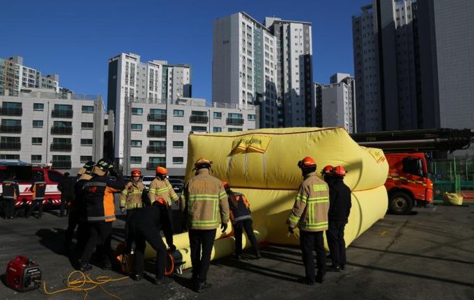 (포탈뉴스통신) 서산소방서는 고층건물 화재 및 추락 위험 상황에 대비해 공기안전매트 신속 설치‧운용 훈련을 실시했다.