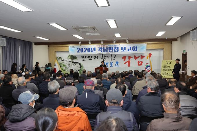 군정 홍보영상 상영을 시작으로 인재육성장학금 및 노인복지기금 등 기탁식, 퇴임 이장 공로패 및 신임 이장 뱃지 전달, 읍․면별 핵심 현안보고, 2026년 군정 주요 추진현황, 현안 토의 순으로 이어졌다.