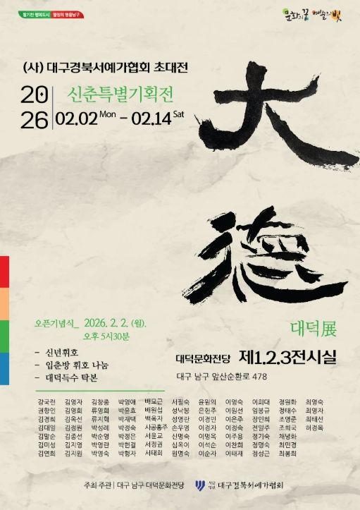 (포탈뉴스통신) 대구 남구 대덕문화전당이 진한 묵향과 함께 전통의 서예 정신을 만끽할 수 있는 그룹전 '대덕전(大德展)'을 2026년 신춘특별기획 전시로 개최한다.