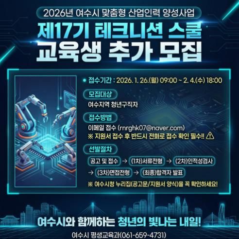 (포탈뉴스통신) 여수시가 지역 산업 수요에 맞는 전문 인력을 양성하기 위해 추진하는 ‘2026년 여수시 맞춤형 산업인력 양성사업’의 일환인 '테크니션 스쿨 제17기' 교육생을 추가 모집한다고 밝혔다.