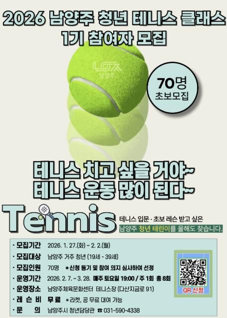 (포탈뉴스통신) 남양주시는 27일부터 내달 2일까지 ‘2026 남양주 청년 테니스 클래스 1기’ 참여자를 모집한다고 밝혔다.