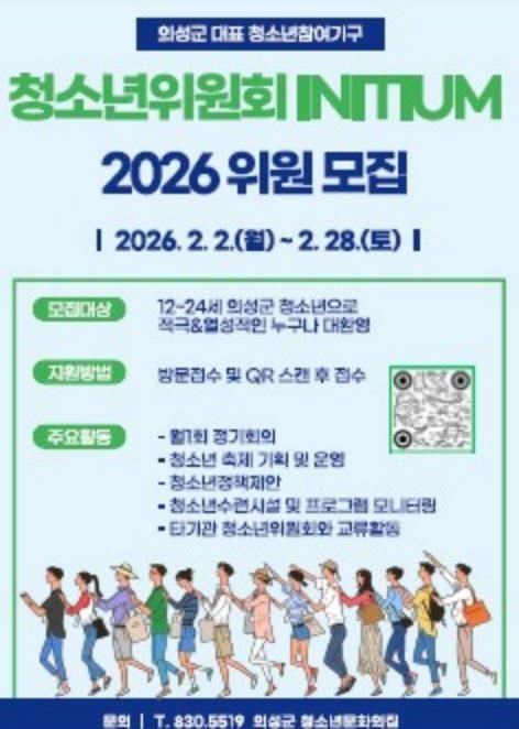 (포탈뉴스통신) 의성군은 청소년의 자치권 확대와 참여권 보장을 위해 ‘2026 의성군청소년위원회’ 신규 위원 20명을 모집한다고 밝혔다.