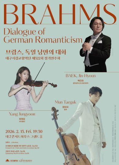 (포탈뉴스통신) 두 악기가 주고받는 정교한 선율에서 오케스트라가 만드는 밀도 높은 호흡까지, 대구시립교향악단은 오는 2월 13일 오후 7시 30분, 대구콘서트하우스 그랜드홀에서 '제522회 정기연주회 : 브람스, 독일 낭만의 대화'를 선보인다.