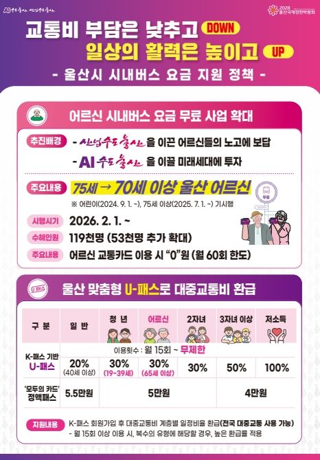 먼저 울산시는 민선 8기 후반기 역점 시책인 ‘울부심 생활+ 사업’의 일환으로, 오는 2월 1일부터 어르신 시내버스 요금 무료 사업 대상을 기존 75세에서 70세 이상으로 확대 시행한다.