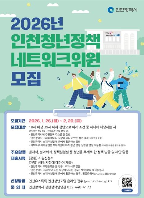 (포탈뉴스통신) 인천광역시는 청년이 정책의 수혜자를 넘어 직접 정책을 기획하고 실험하는 주체로 참여할 수 있도록 '2026년 인천청년정책네트워크' 청년위원을 1월 29일부터 2월 20일까지 공개 모집한다고 밝혔다.