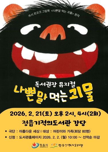 (포탈뉴스통신) 정읍기적의도서관은 겨울방학을 맞이해 어린이와 가족이 함께 즐길 수 있는 창작 뮤지컬 ‘나쁜 말 먹는 괴물’을 오는 21일 오후 2시와 4시, 총 2회 공연한다.