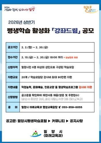 (포탈뉴스통신) 경남 밀양시는 시민이 원하는 시간과 장소에 맞춤형 평생학습 프로그램을 제공하는 2026년 상반기 평생학습 활성화 사업 ‘강좌드림’의 공모를 추진하고, 오는 13일부터 신청을 받는다고 밝혔다.