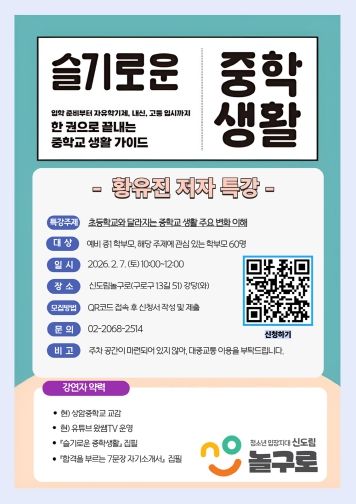 ‘신도림놀구로’에서는 예비 중학생 학부모를 위한 ‘슬기로운 중학 생활’ 황유진 저자 특강이 열린다. 오전 10시부터 두 시간 동안 진행되는 이번 강연은 중학교 생활의 주요 변화와 학습 환경 등을 소개해 학부모의 이해를 돕고, 자녀 지도에 실질적인 도움을 주는 내용으로 구성됐다.
