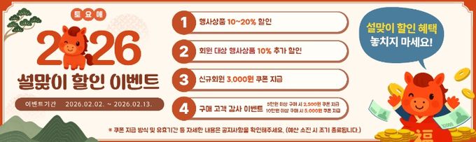 이번 설맞이 할인이벤트에 대한 자세한 내용은 토요애 쇼핑몰 홈페이지를 통해 확인할 수 있다.