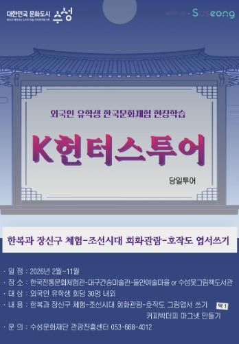 (포탈뉴스통신) 대구 수성문화재단은 올해 2월부터 11월까지 대구·경북 외국인 유학생을 대상으로 한국문화체험 현장학습 ‘K헌터스 투어’를 운영한다.