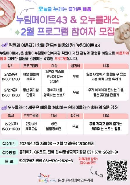 (포탈뉴스통신) 파주시 운정다누림장애인복지관은 참여형 평생학습 프로그램 ‘누림메이트43’을 운영하며, 정규 강좌로는 담기 어려운 소규모 학습 수요를 반영한 생활 밀착형 배움을 실천하고 있다.