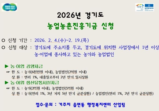 (포탈뉴스통신) 이천시는 농업인에게 장기·저리 융자 지원을 실시하고 경영안정을 돕기 위해 2026년 경기도 농업농촌진흥기금 농어업 경영자금, 농어업 생산유통시설자금 사업에 대한 신청을 2월 3일부터 접수한다.