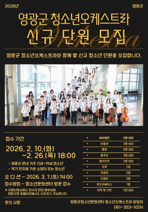 (포탈뉴스통신) 영광군은 지역 청소년들의 문화예술 역량 강화와 건전한 성장을 지원하기 위해 ‘2026년 영광군 청소년오케스트라 신규 단원’을 모집한다고 밝혔다.
