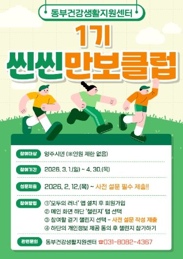 (포탈뉴스통신) 양주시보건소 동부 건강생활지원센터에서는 지역 주민의 건강생활실천율 향상 및 비만율 개선을 위해 2026년도 ‘씬씬 만보클럽’ 1기 참여자를 모집한다.
