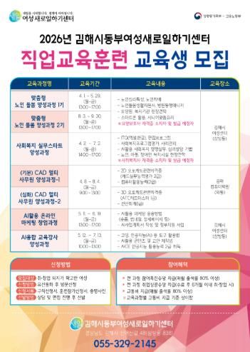 (포탈뉴스통신) (재)김해시복지재단 동부여성새로일하기센터는 여성들의 취·창업 역량을 강화하고 지역사회의 특성과 시대적 흐름에 맞춘 여성 특화 직업교육훈련 과정의 교육생을 지난 2일부터 모집한다고 밝혔다.