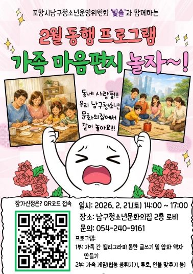 (포탈뉴스통신) 포항시청소년재단 남구청소년문화의집은 오는 21일 토요일 청소년 및 남구 지역 주민들을 위한 동행 2월 프로그램 ‘가족 마음 편지 놀자’를 진행하고 참가자를 모집한다.