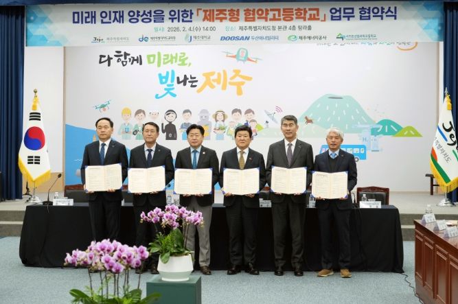 제주특별자치도와 제주특별자치도교육청은 4일 오후 2시 탐라홀에서 제주대학교, 두산에너빌리티, 제주에너지공사, 서귀포산업과학고등학교와 '제주형 협약고등학교(에너지 분야)' 운영을 위한 업무협약을 체결했다.