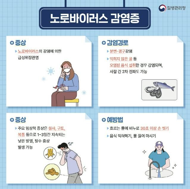 주요 감염 경로는 노로바이러스에 오염된 어패류 섭취이며, 특히 겨울철 제철 음식인 굴, 조개 등을 생으로 먹거나 충분히 익히지 않고 섭취할 경우 감염 위험이 높다.
