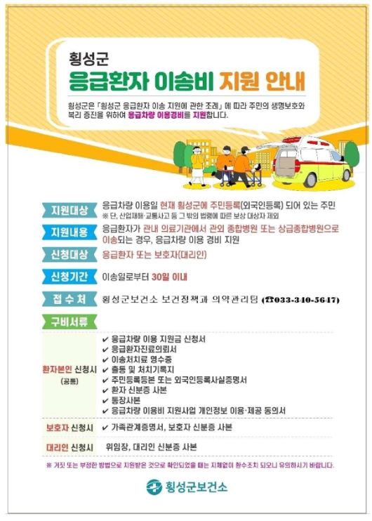 (포탈뉴스통신) 횡성군보건소는 군민의 응급 의료 안전망 강화를 위해 ‘응급환자 이송비 지원사업’을 올해도 지속 추진한다고 밝혔다.
