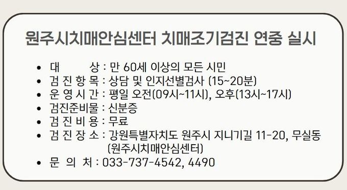(포탈뉴스통신) 원주시치매안심센터는 치매 조기 발견과 적기 치료를 위해 지역 내 60세 이상 주민을 대상으로 치매 조기 검진 사업을 연중 실시하고 있다.