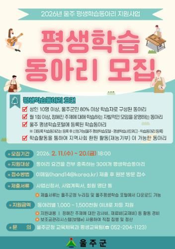 (포탈뉴스통신) 울산 울주군이 오는 11일부터 20일까지 ‘2026년 우수 평생학습동아리 지원사업’ 참여 동아리를 모집한다고 5일 밝혔다.