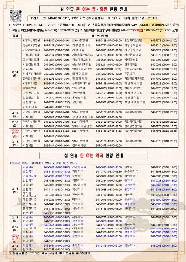 설 연휴 기간 귀성객과 군민의 의료 이용 불편을 최소화하기 위해 응급의료기관의 24시간 응급실 운영, 야간진료실 및 달빛어린이병원 운영과 문 여는 병·의원 및 약국 지정을 통해 응급진료체계를 강화한다.