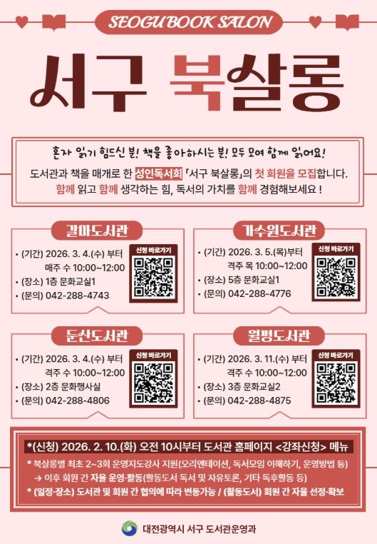 (포탈뉴스통신) 대전 서구 4개 공공도서관(갈마, 가수원, 둔산, 월평)은 주민들을 대상으로 책과 도서관을 매개로 한 성인 독서회 ‘서구 북살롱’을 운영한다고 5일 전했다.