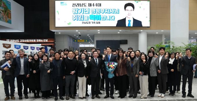 황기연 부지사는 “고향 발전을 위해 다시 일할 기회를 갖게 돼 영광스럽다”며 “전남·광주의 역사적인 대통합과 AI·에너지 수도 대도약 기틀 마련을 위해 직원들과 함께 머리를 맞대면서 최선을 다하겠다”고 포부를 밝혔다.