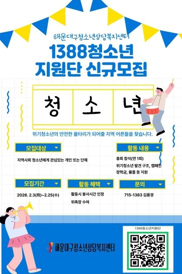 (포탈뉴스통신) 해운대구 청소년상담복지센터는 지역 내 위기청소년들을 조기에 발견하고 든든한 울타리가 되어줄 ‘1388청소년지원단’을 이달 25일까지 공개 모집한다고 밝혔다.