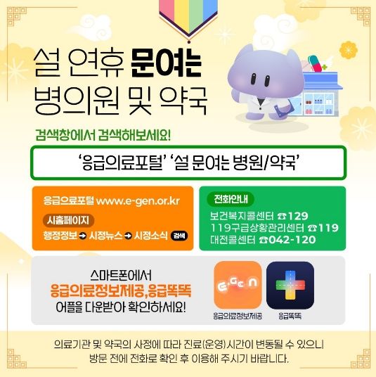 연휴 기간 운영하는 병․의원 및 약국 정보는 ▲대전시 및 자치구 홈페이지 ▲응급의료포털 ▲‘응급의료정보제공’ 및 ‘응급똑똑’ 앱(App)에서 확인할 수 있으며, ▲119(구급상황관리센터) ▲120(대전시 콜센터) ▲129(보건복지콜센터)를 통해서도 안내받을 수 있다.