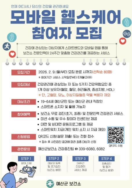 (포탈뉴스통신) 예산군 보건소는 오는 9일부터 ‘2026년 모바일 헬스케어 사업’ 참여자 80명을 선착순 모집한다.