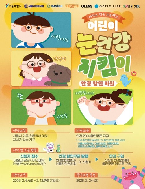 (포탈뉴스통신) 서울시가 새 학기를 맞아 스마트폰 등 디지털 기기를 자주 접하는 어린이들의 눈 건강을 위해 눈 검진(시력검사)과 최대 20%의 안경 구입 할인을 지원하는 ‘서울 어린이 눈건강 지킴이 사업’ 1차 신청을 받는다.