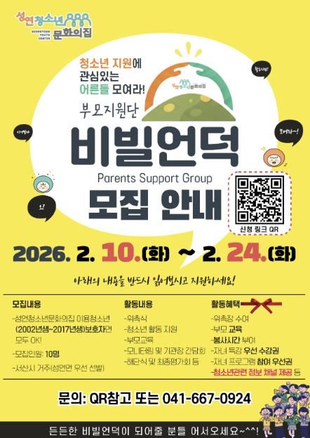 (포탈뉴스통신) 성연청소년문화의집은 2026년 한 해 동안 지역 청소년의 건강한 성장과 안정적인 발달을 지원하기 위해, 청소년 보호자를 대상으로 부모지원단 ‘비빌언덕’ 참여자를 2월 10일부터 2월 24일까지 모집한다고 밝혔다.