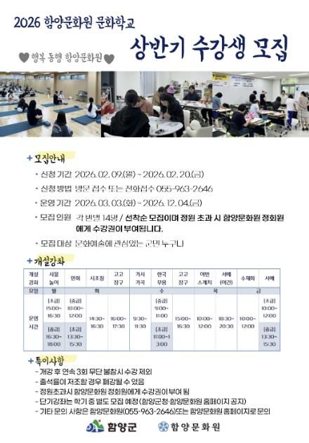 개설되는 강좌는 △사물놀이(초·중급) △민화(초·중급) △시조창 △고고장구(화·수) △가사가곡 △한국무용(초·중급) △어반스케치 △서예(초·중급·야간) △수채화 로 15개 반이 운영될 예정이다. 강좌별 모집 정원은 14명이며 신청 인원이 정원을 초과할 경우 함양문화원 정회원에게 수강 기회가 우선 배부될 예정이다. 수강 신청은 2월 9일부터 2월 20일까지 진행되며, 방문 접수 또는 전화를 통해 신청할 수 있다. 문화학교는 3월 3일 개강 예정이다.