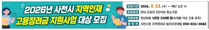 (포탈뉴스통신) 사천시는 청년 취업난과 중소기업체의 인력난 해소를 위해 2026년 사천시 지역인재 고용장려금 지원사업 참여기업을 모집한다고 6일 밝혔다.