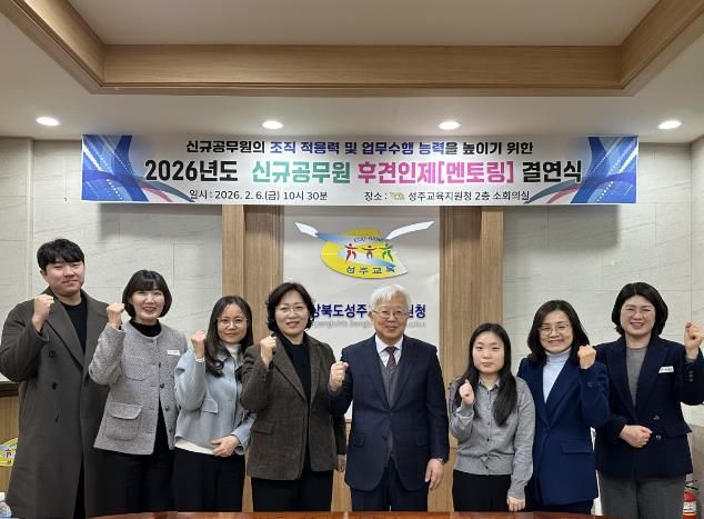 (포탈뉴스통신) 경상북도성주교육지원청은 6일 소회의실에서 2026. 1. 1.자 신규 공무원 1명, 멘토 공무원 2명이 참석하여 신규 공무원의 조직 적응력을 높이고 자신감 있는 공직 생활을 유도하고자 후견인제(멘토링) 결연식과 직무연수를 가졌다.