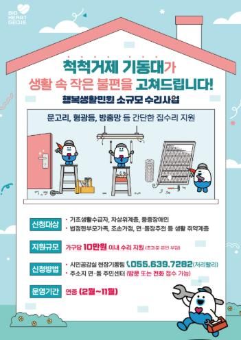 (포탈뉴스통신) 거제시는 일상생활 속 소소하지만 해결이 어려운 불편을 겪고 있는 취약계층을 지원하기 위해 2026년 '척척거제 기동대 행복생활민원 소규모 수리사업'을 추진한다고 밝혔다.